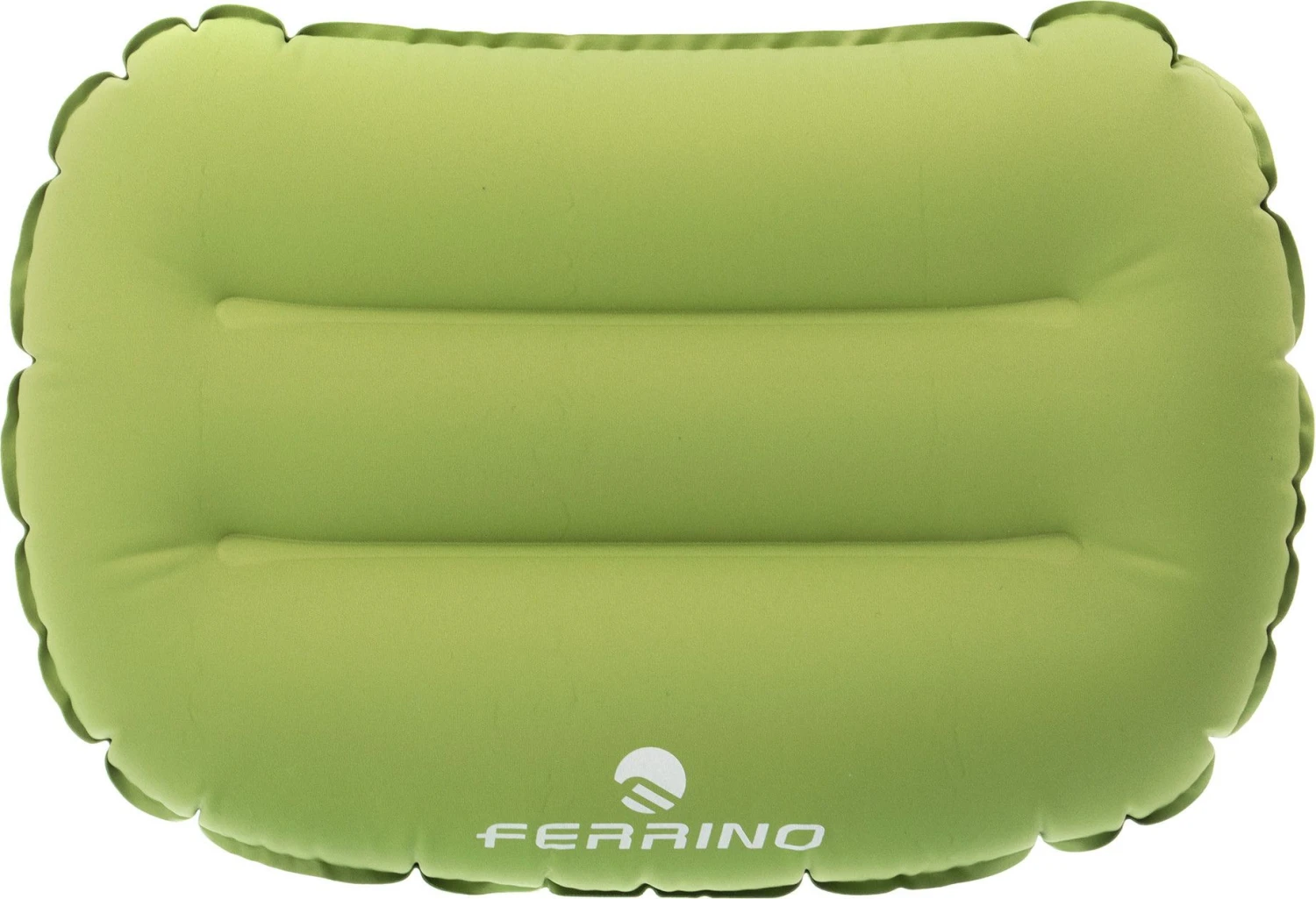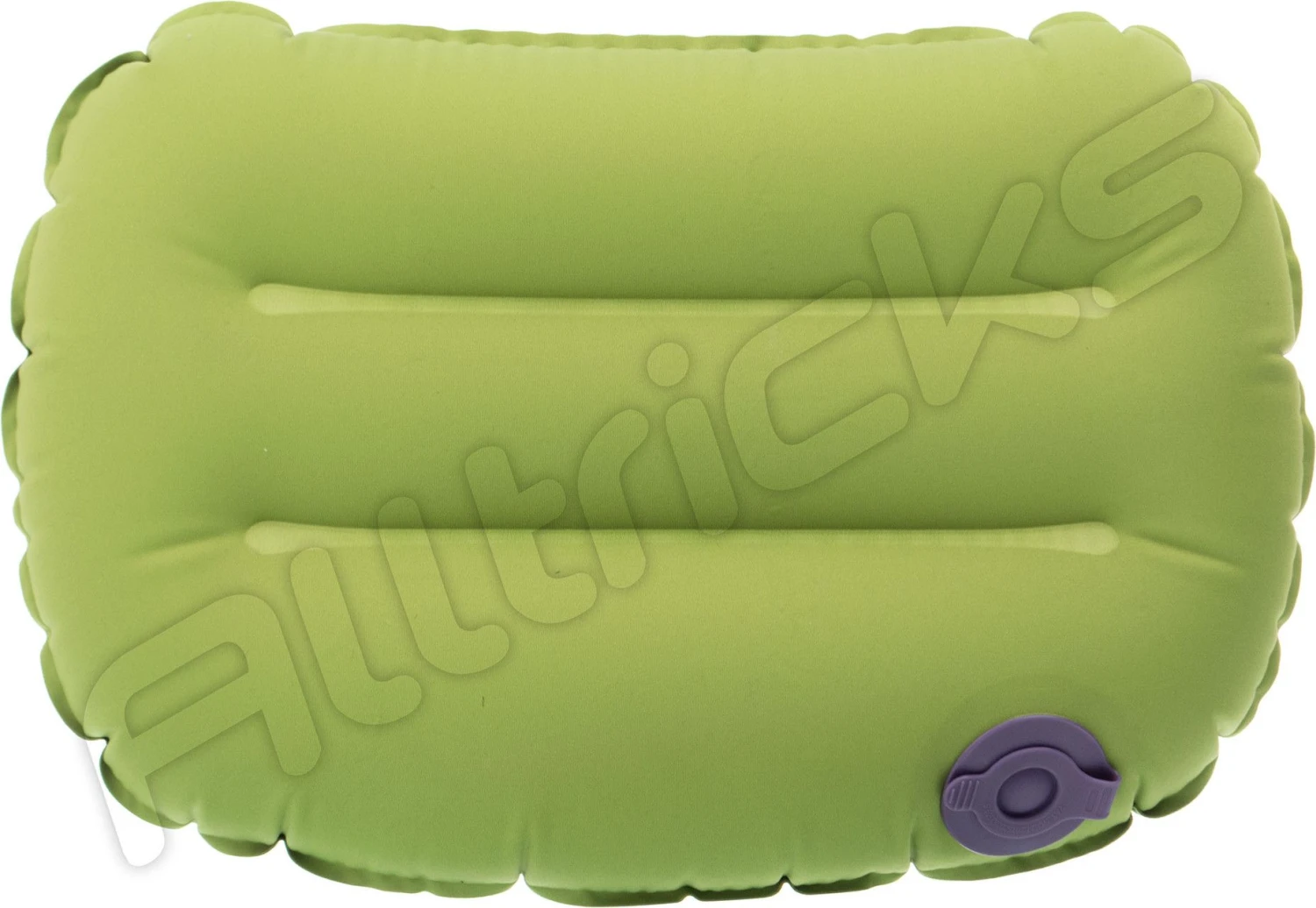 Handy inflatable pillow in stretch polyester, with valve complete with safety membrane for quick and easy inflation and deflation. Compact carry pouch.