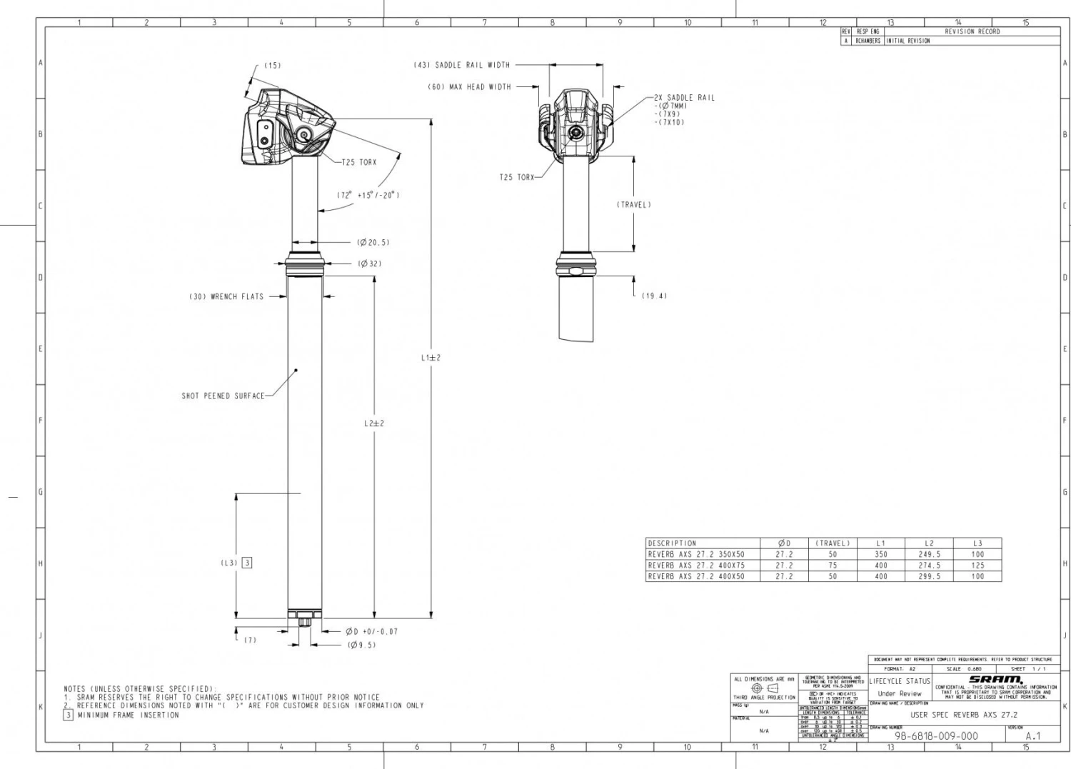 - 00.6818.062.001 / Seatpost REVERB AXS XPLR 27.2mm 50mm Travel 400mm (includes battery & charger) Remote / AXS Controller Sold Separately A1